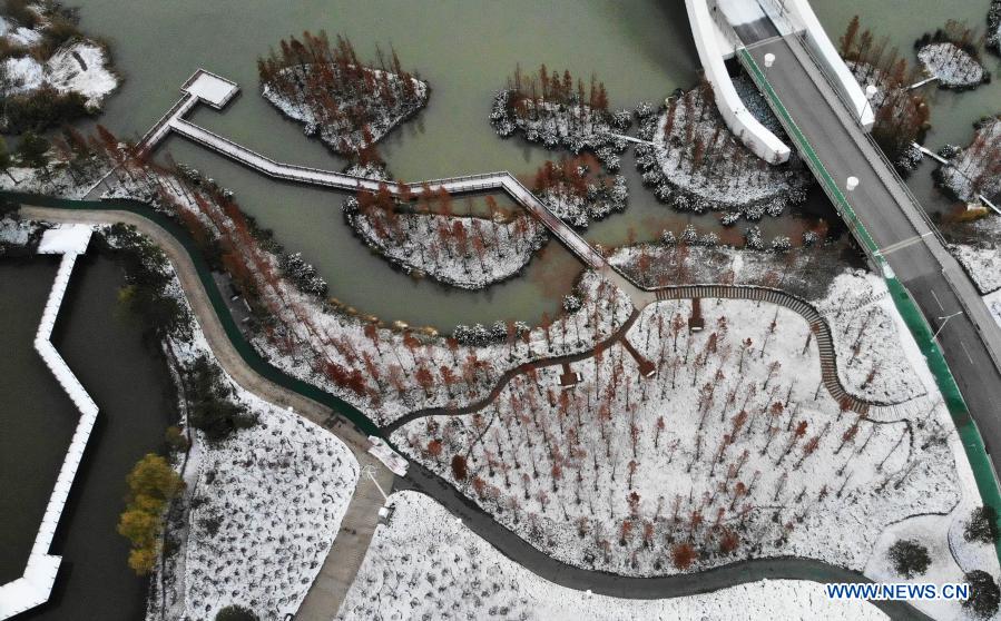 Aerial photo taken on Dec. 14, 2020 shows the snow scenery of an ecological and cultural park in Sanwan area of Yangzhou, east China's Jiangsu Province. Snow has fallen in many parts of the country in recent days. (Photo by Meng Delong/Xinhua)