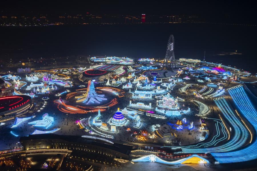 An aerial drone photo shows tourists visiting the Harbin Ice-Snow World in Harbin, northeast China's Heilongjiang Province, Jan. 23, 2025. (Xinhua/Zhang Tao)