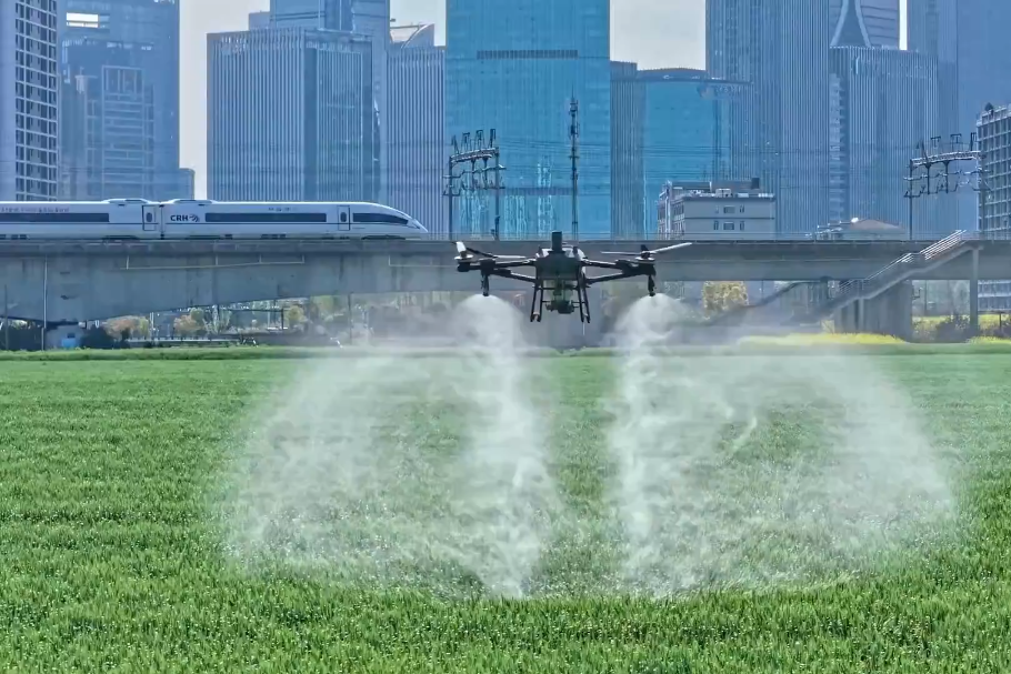 In Hangzhou, Zhejiang province, a high-speed train passes skyscrapers in the backdrop as a drone works in a nearby field, capturing a snapshot of modern China in motion.